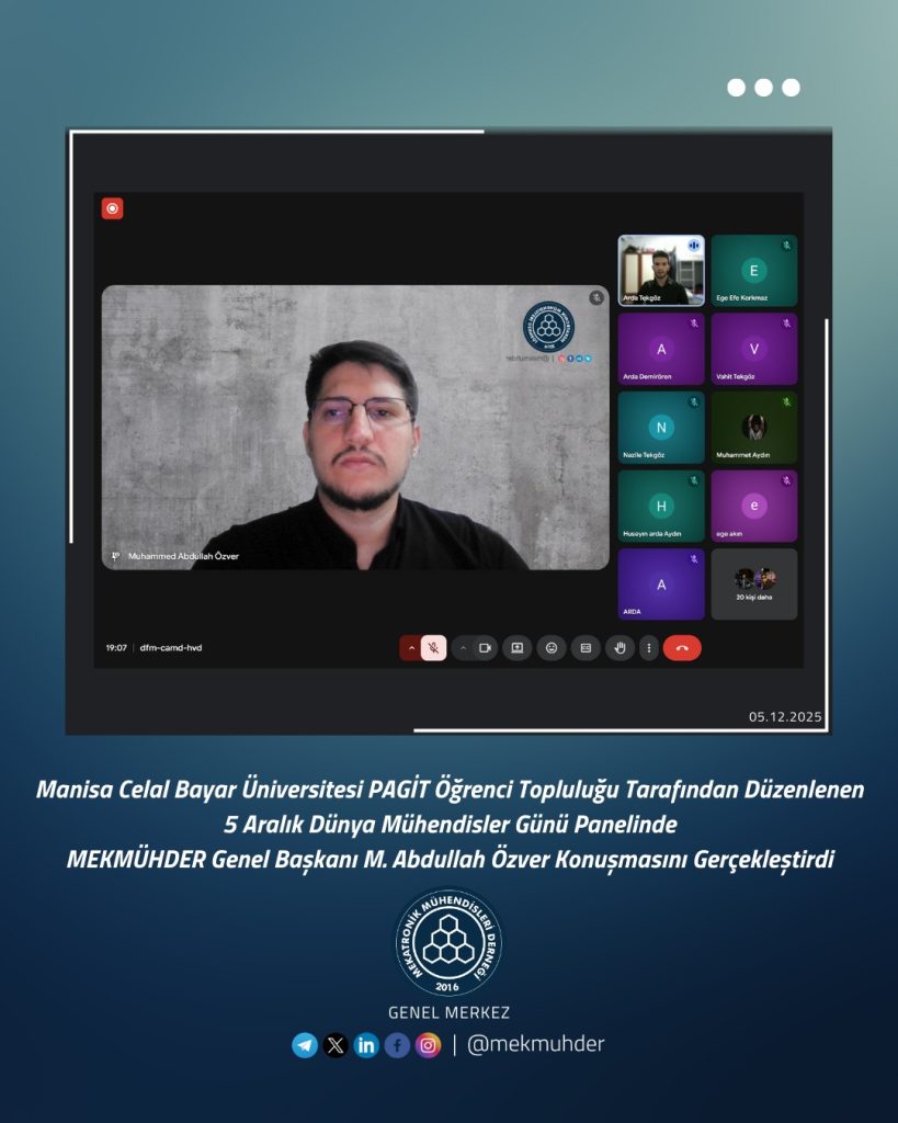 Manisa Celal Bayar Üniversitesi PAGİT Öğrenci Topluluğu tarafından düzenlenen 5 Aralık Dünya Mühendisler Günü Panelinde, MEKMÜHDER Genel Başkanı M. Abdullah Özver, mühendisliğin geleceği, mekatronik disiplininin yükselen rolü ve genç mühendisler için kariyer perspektifleri üzerine bir konuşma gerçekleştirdi.