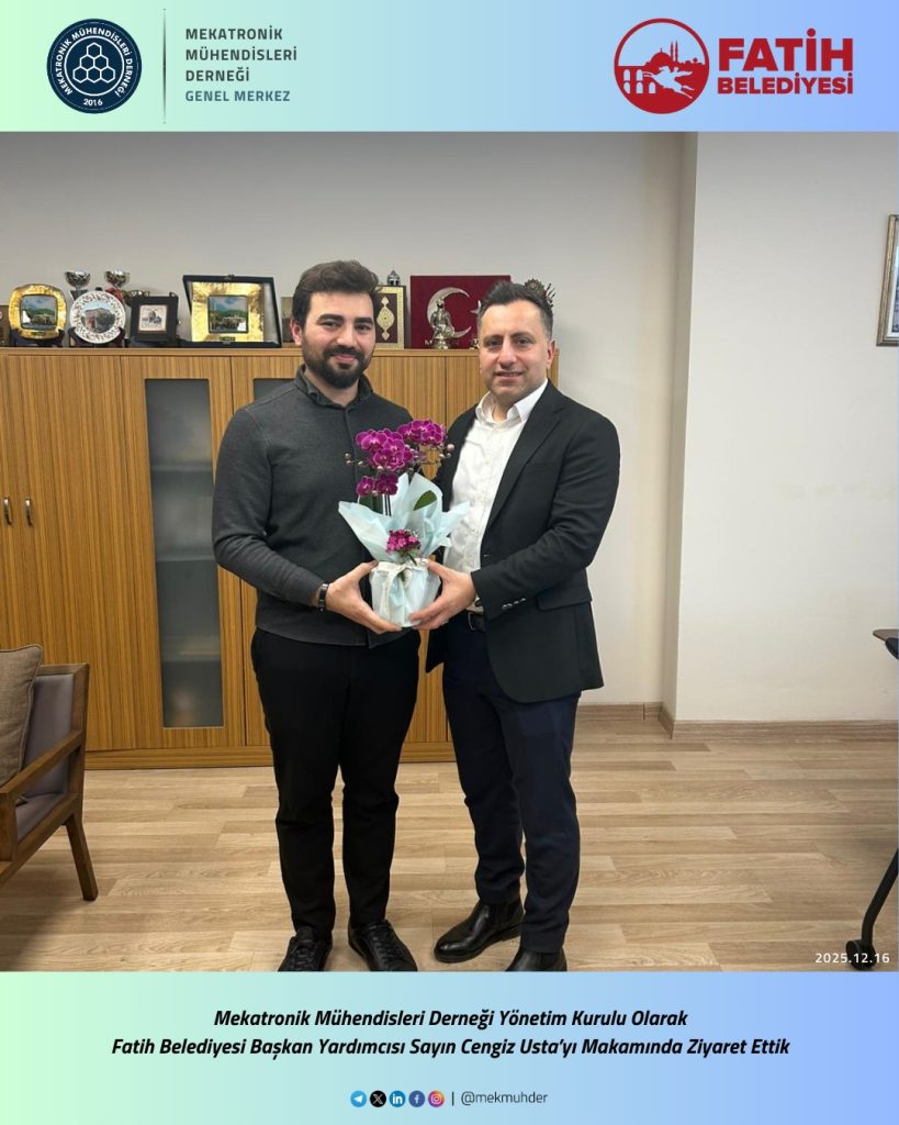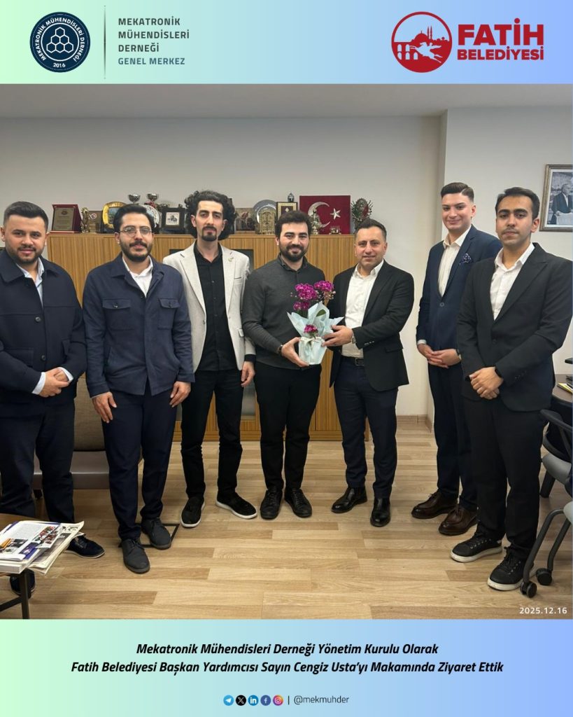 Bugün Mekatronik Mühendisleri Derneği (MEKMÜHDER) olarak, Fatih Belediyesi Başkan Yardımcısı Sayın Cengiz Usta’yı makamında ziyaret ettik.