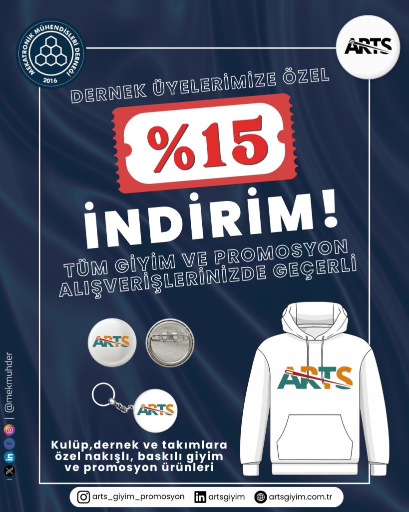 Mekatronik Mühendisleri Derneği (MEKMUHDER) olarak, üyelerimize sağladığımız faydaları artırmak amacıyla çalışmalarımıza devam ediyoruz. Bu doğrultuda, kulüp, dernek ve takımlara yönelik özelleştirilmiş giyim ve promosyon ürünleri alanında uzman olan ARTS Giyim ile özel bir iş birliği anlaşması imzalanmıştır.
