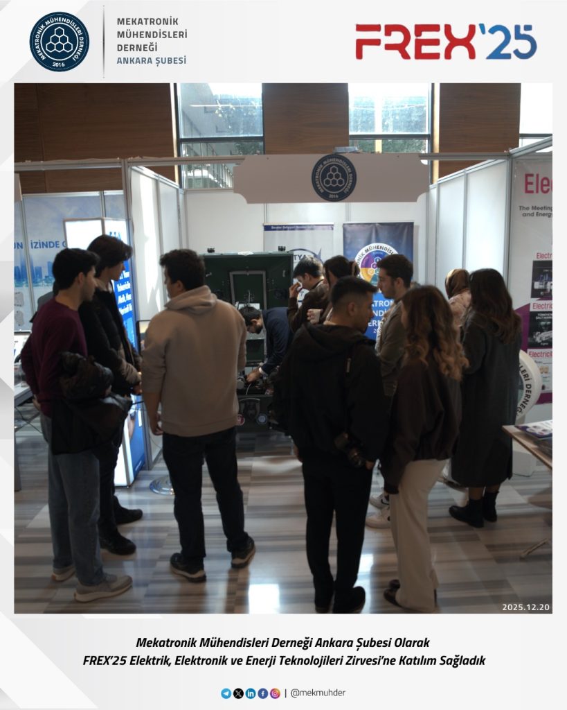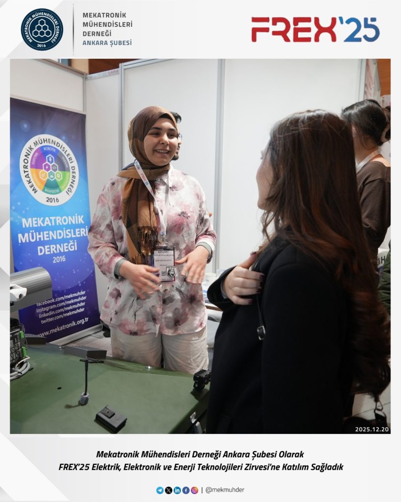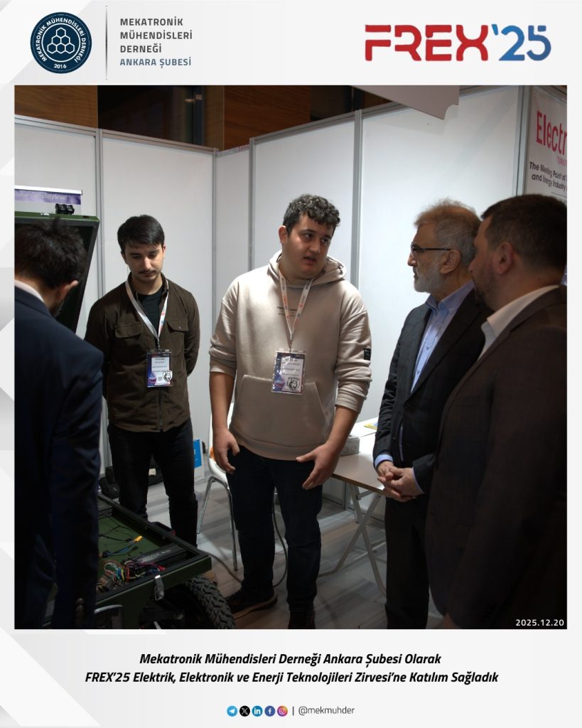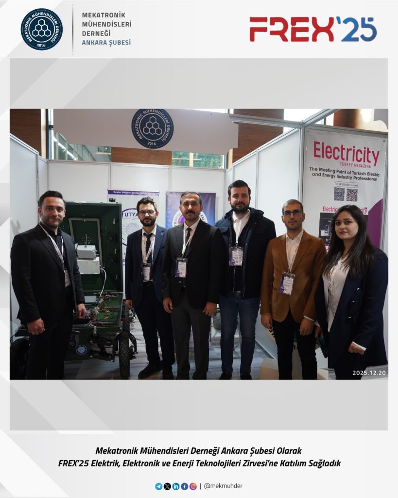 As the Ankara Branch of the Mechatronics Engineers Association (MEKMÜHDER), we participated in the FREX’25 Electricity, Electronics and Energy Technologies Summit. During the summit, where current developments in electricity, electronics, and energy technologies were addressed, we closely followed innovations in the sector, engineering applications, and interdisciplinary interactions.