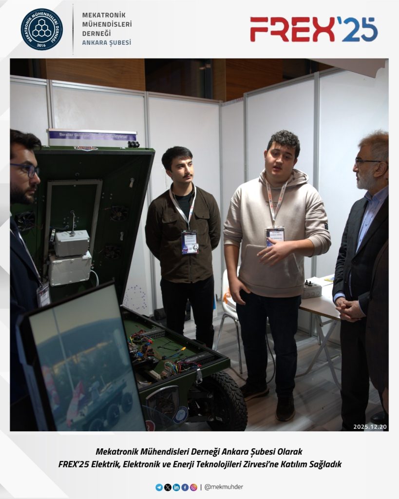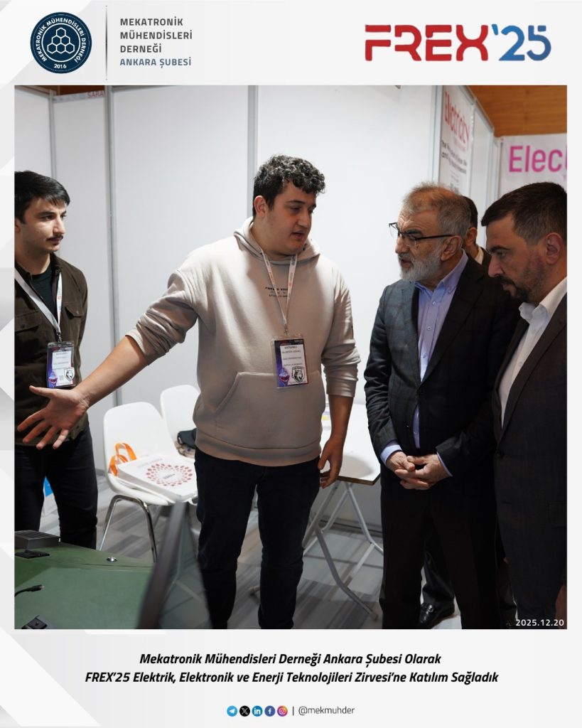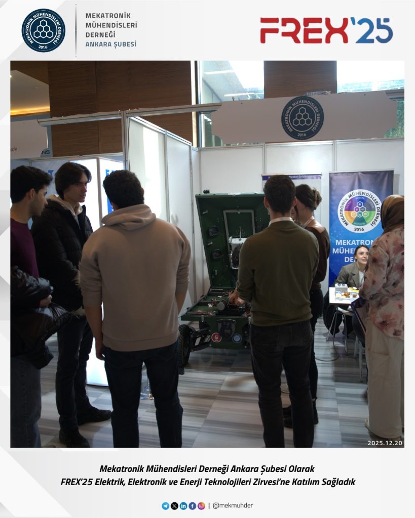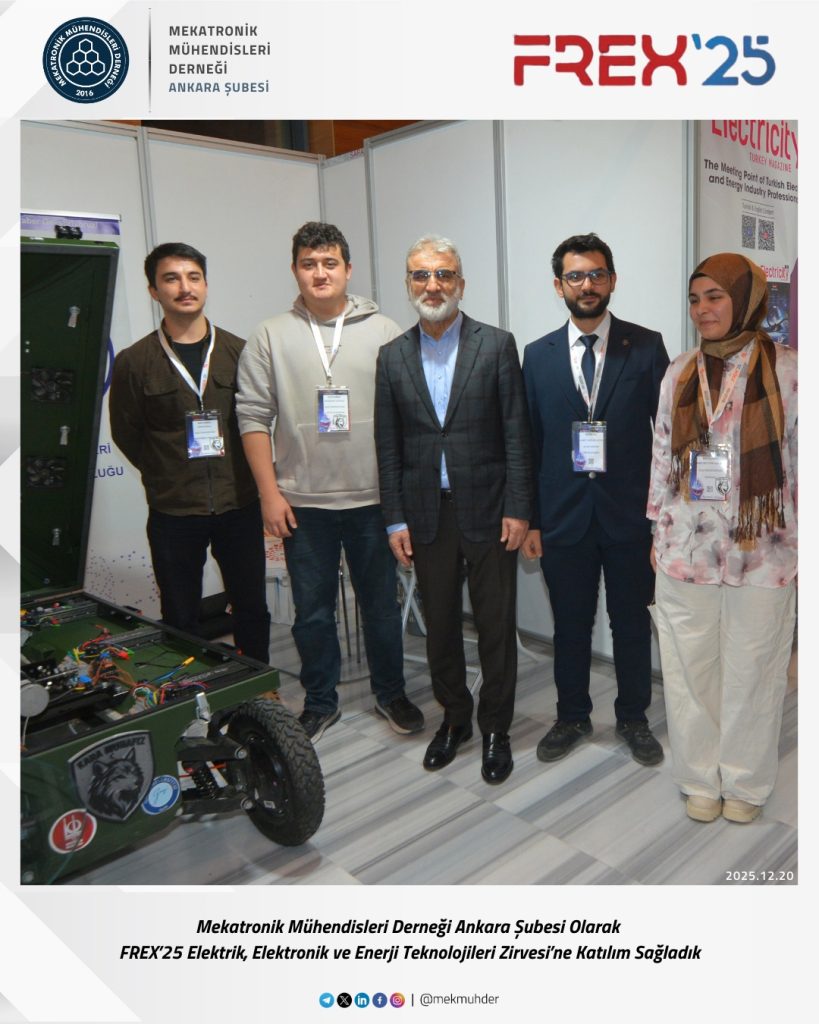 As the Ankara Branch of the Mechatronics Engineers Association (MEKMÜHDER), we participated in the FREX’25 Electricity, Electronics and Energy Technologies Summit. During the summit, where current developments in electricity, electronics, and energy technologies were addressed, we closely followed innovations in the sector, engineering applications, and interdisciplinary interactions.