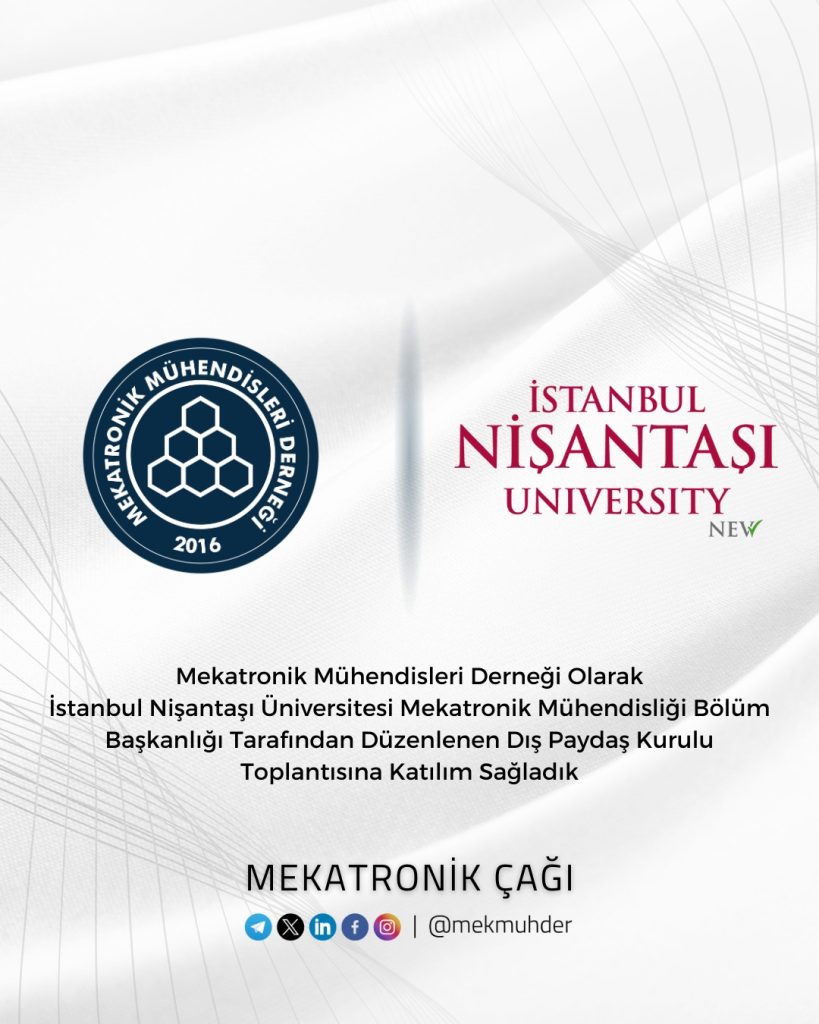 Mekatronik Mühendisleri Derneği (MEKMÜHDER) olarak, İstanbul Nişantaşı Üniversitesi Mekatronik Mühendisliği Bölüm Başkanlığı tarafından düzenlenen Dış Paydaş Kurulu Toplantısına katılım sağladık.