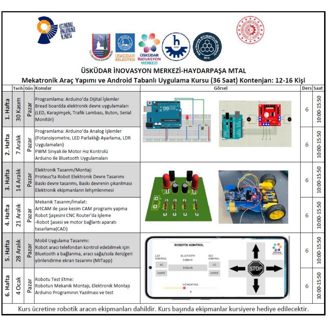 Kursiyerlere; sıfırdan yapacakları robotla ilgili arduino programlama, elektronik devre ve mekanik tasarım yanında imalatı ve android uygulama (MIT App İnventor) da anlatılacaktır.