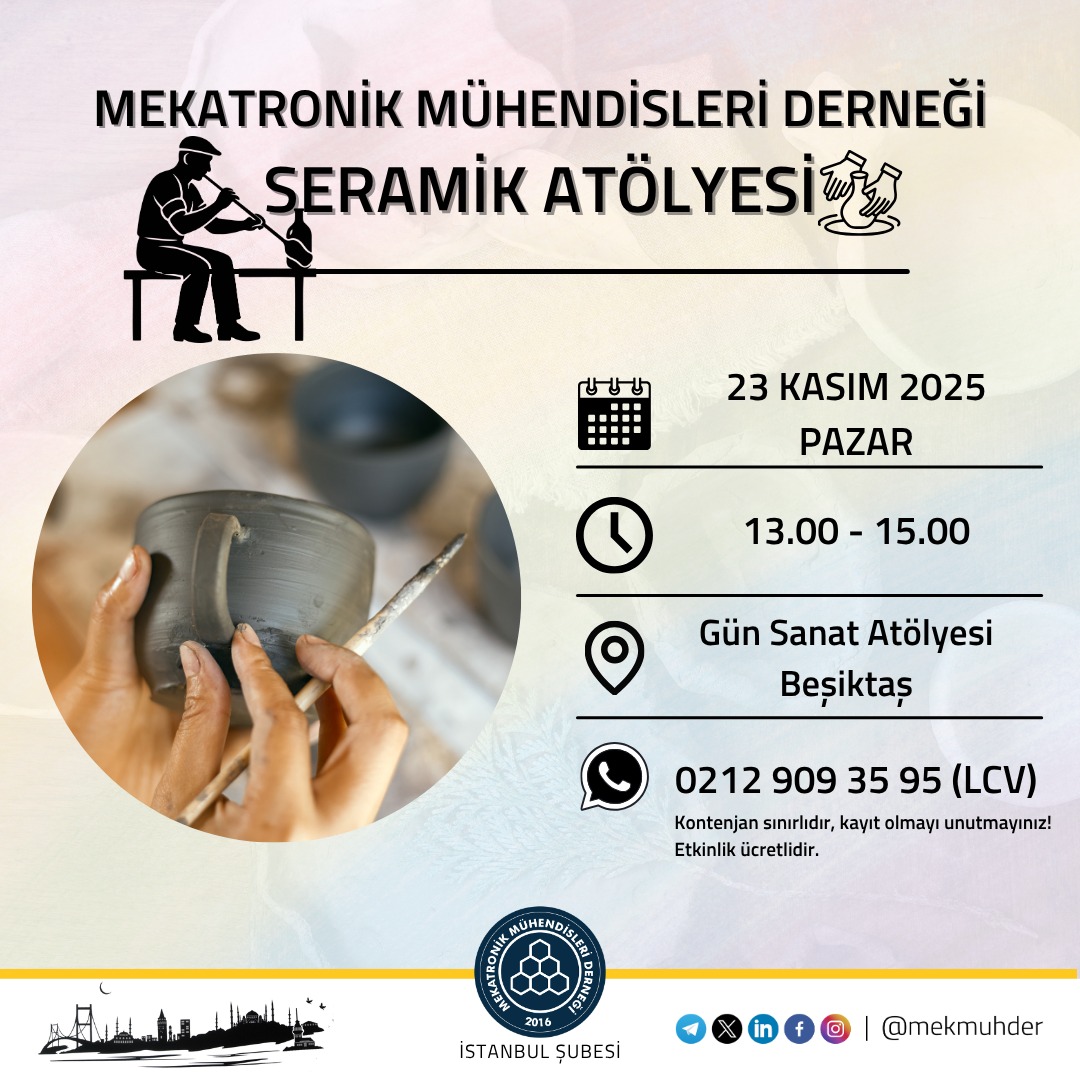 Mekatronik Mühendisleri Derneği (MEKMÜHDER) İstanbul Şubesi, teknolojiye kısa bir mola verip yaratıcılığa yönelmek isteyen üyelerini ve katılımcılarını Seramik Atölyesi etkinliğine davet ediyor! 🎨🖐️
