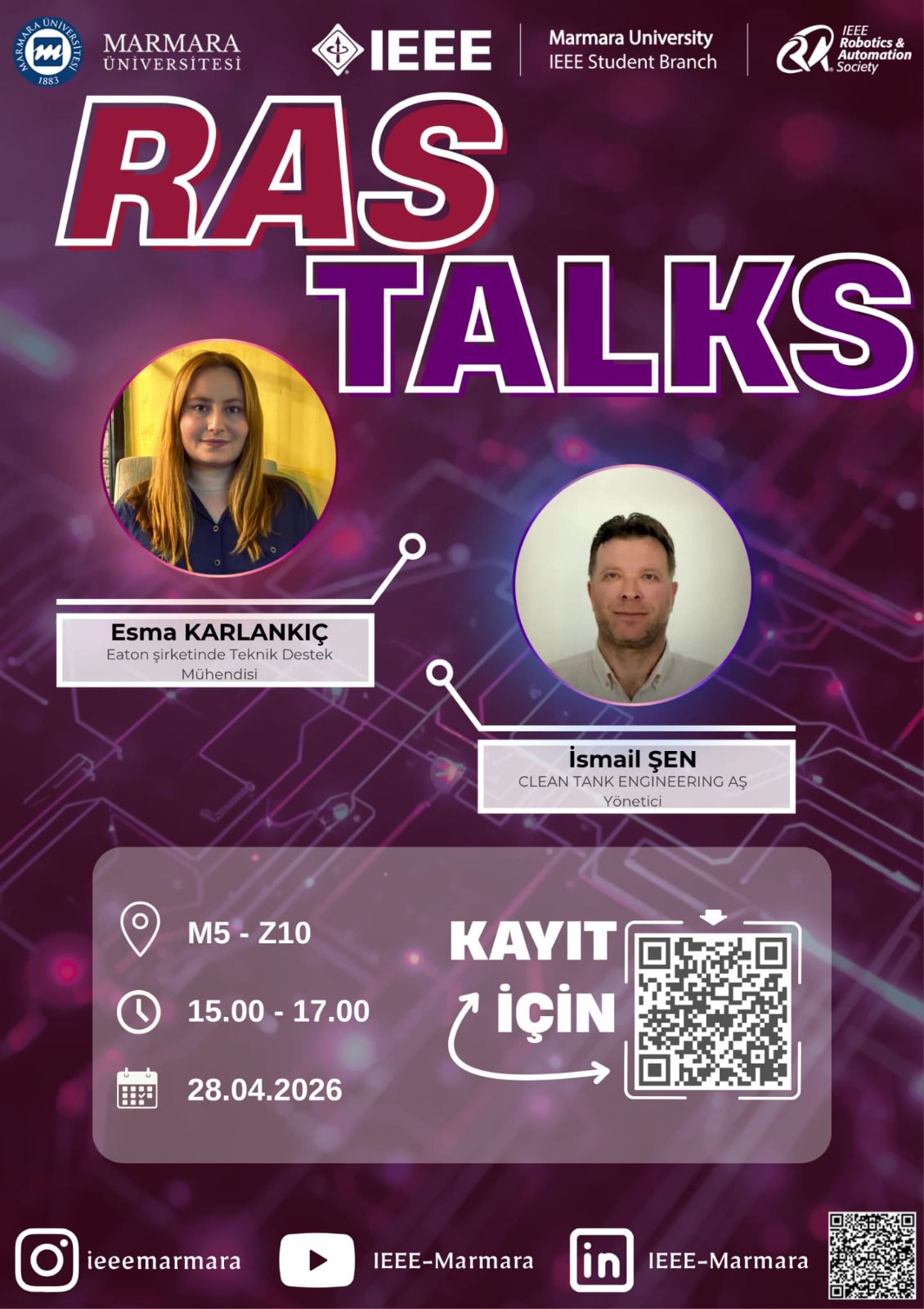 At the “RAS Talks” event organized by IEEE Marmara University Student Branch RAS Committee; our MEKMÜHDER Secretary General and Eaton Technical Support Engineer Esma KARLANKIÇ, along with CLEAN TANK ENGINEERING Manager İsmail ŞEN, will share their engineering adventures and latest industry developments. 🚀🦾