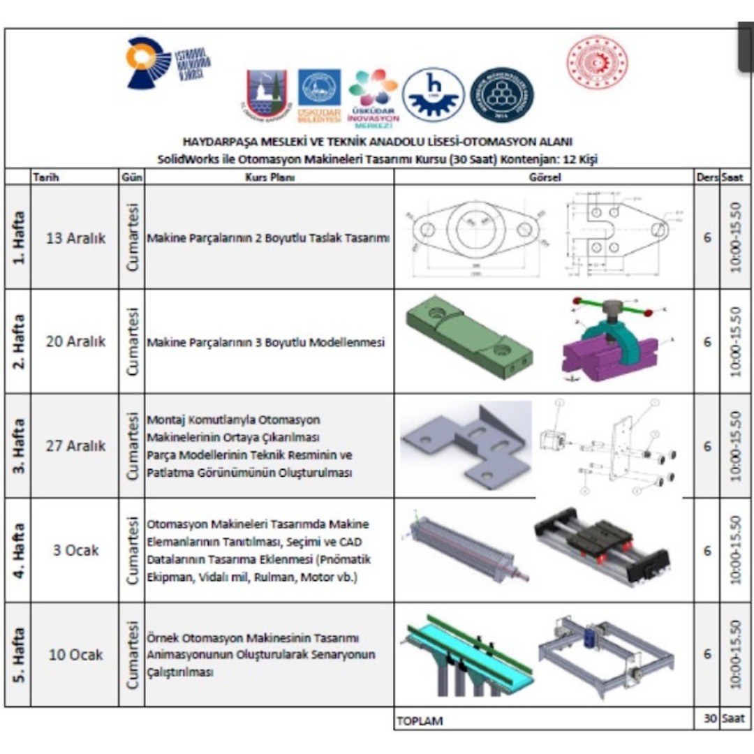 Katılımcıların SolidWorks yazılımı üzerinden makine elemanlarının 2B ve 3B modellemesi, montaj, teknik resim oluşturma ve otomasyon sistemlerinin tasarımı konularında uygulamalı deneyim kazanmasını sağlamak.